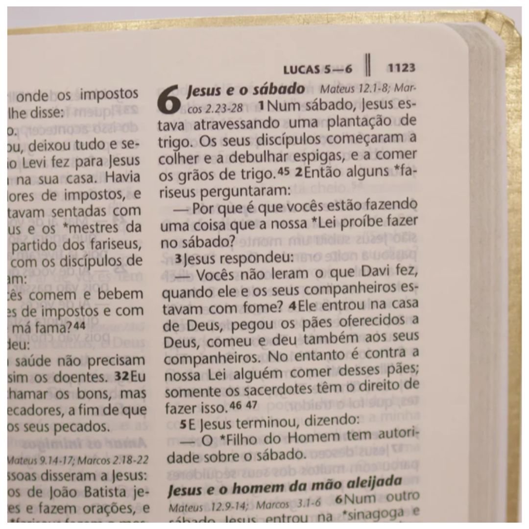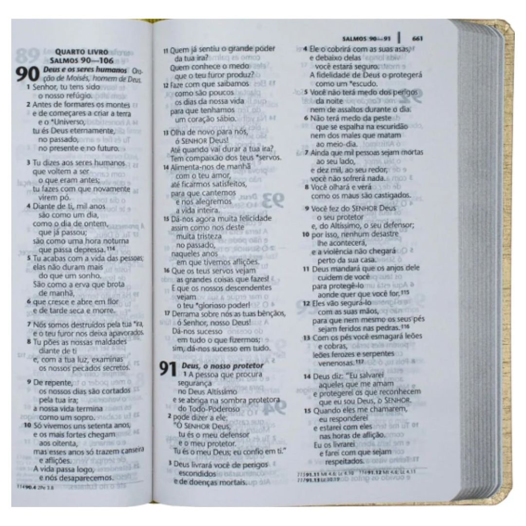 Letra grande e confortável — pensada para facilitar a leitura e proporcionar conforto visual, especialmente em leituras prolongadas ou devocionais.