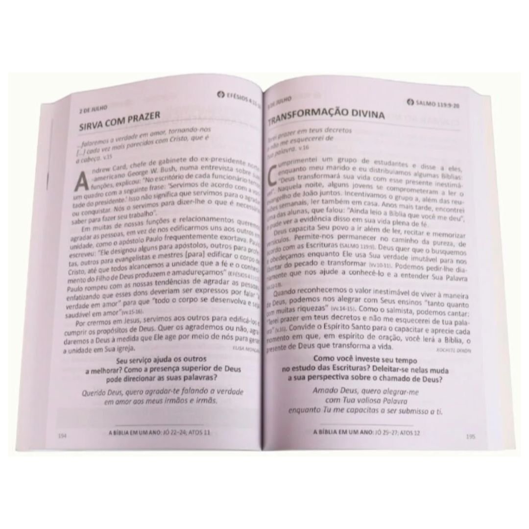 Mais do que um simples devocional, o Pão Diário é um guia prático para quem deseja crescer na fé, confiar plenamente no Senhor e viver os princípios da Palavra de Deus. Cada meditação combina ensino bíblico claro com aplicações para o cotidiano, transformando momentos de leitura em experiências de oração, louvor e aprendizado espiritual.